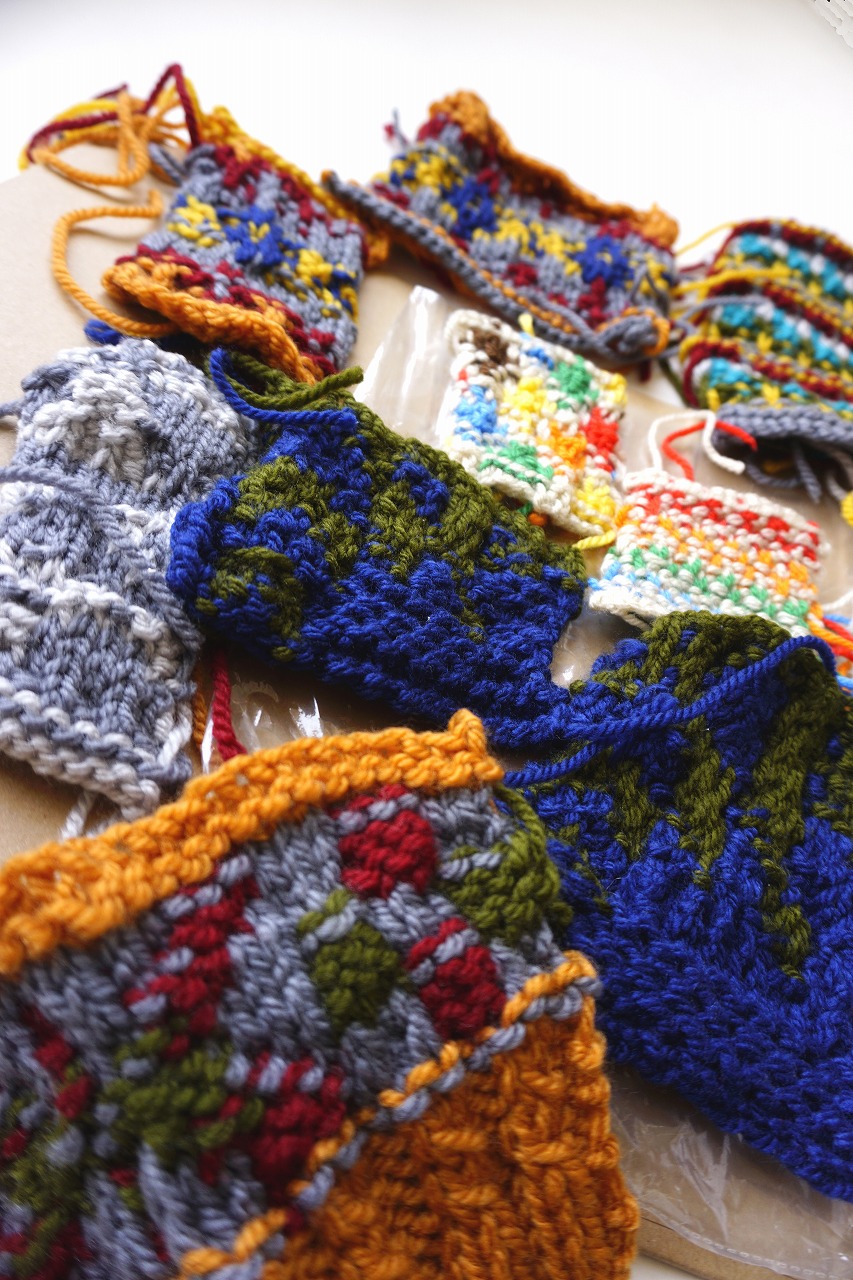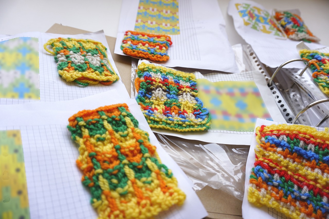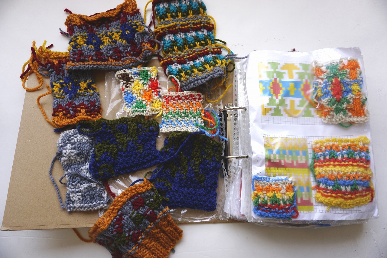 「ネタ帳」作りには、たくさんの糸を使用するため、比較的安価な糸を買い、試編み、修正を繰り返し、編み図(編み記号)を作成します。